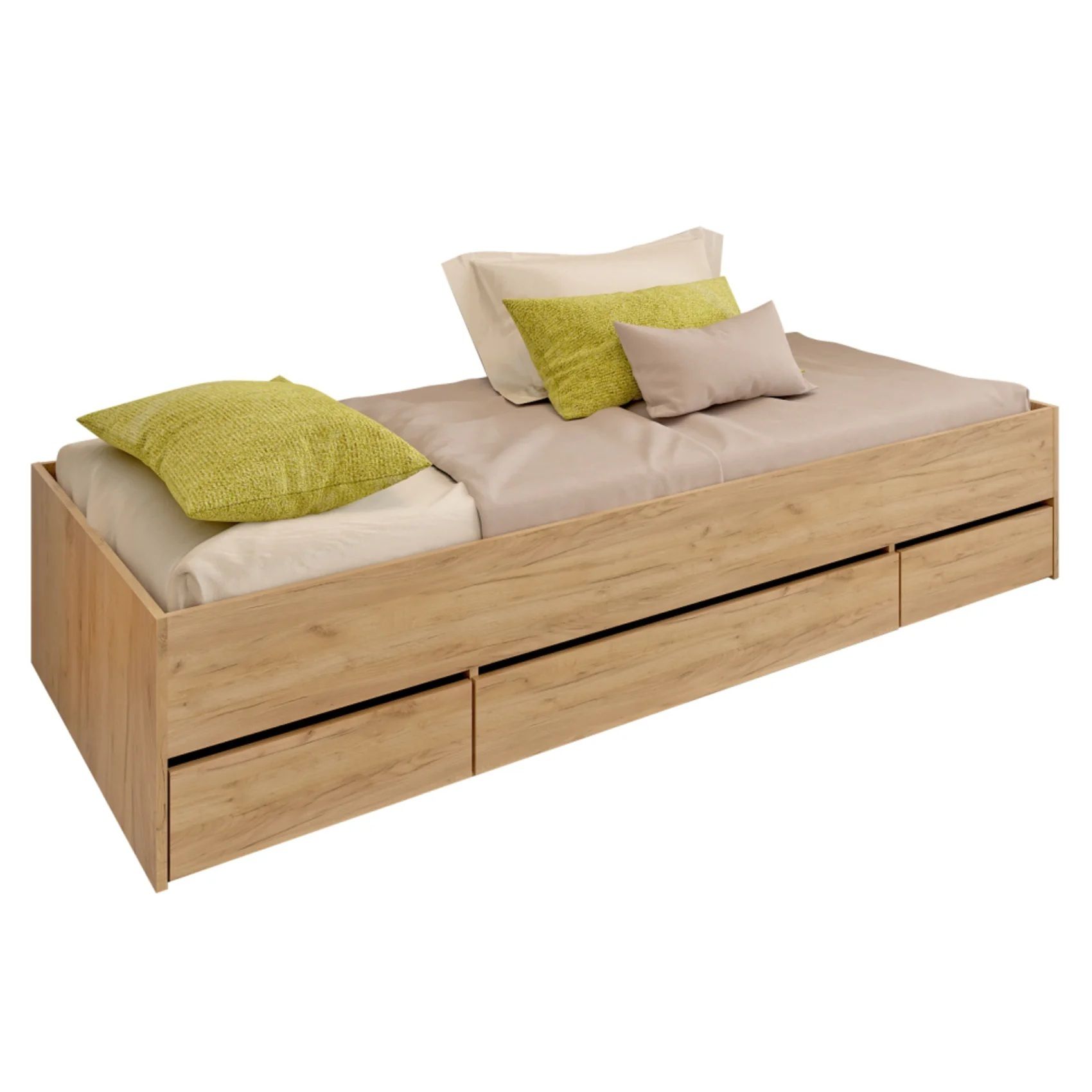 Moderní a velmi praktická postel s úložným porstorem Vám poskytne množství úložného prsotoru. Úložný prostor tvoří tři šuplíky Rozměry dvou stejně velkých šuplíků (ŠxHxV): 49x46,8x16 cm Rozměry středního šuplíku (ŠxHxV): 95,8x46,8x16 cm. Cena postele je bez roštu a matrace. Rošt 90x200cm si můžete objednat v sekci rošty a matraci 90x200cm si můžete objednat v sekci matrace.