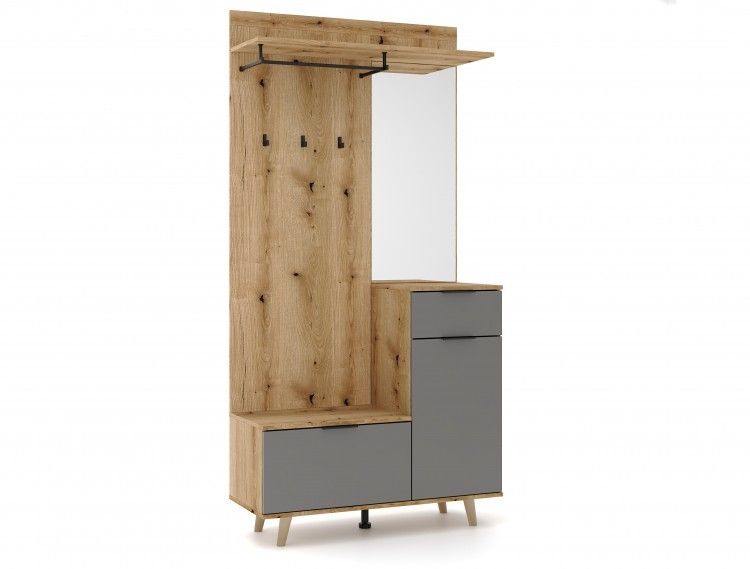 Elegantní, praktická a vzdušná předsíňová stěna v skandinávském stylu o délce 100cm vhodná i do menších předsíňí. Provedení lamino dub artisan/grafit/černá
