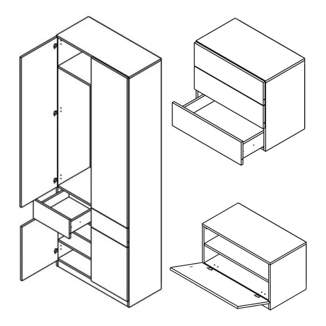 Součástí předsíňové  stěny je botník s výklopem - udržuje pořádek v ukládané obuvi. Uvnitř botníku je k dispozici police, která pomáhá přehledně rozdělit prostor pro obuv. Dále je k dispozici šatní skříň mající ve vrchní části polici, pod ní výsuvnou šatní tyč - ideální pro zavěšení kabátů. Uprostřed skříně jsou šuplíky, vhodné pro uložení drobností + 2 police dole. V sestavě naleznete také věšákový panel, zrcadlo a závěsnou komodu. Vyrábí se dub sonoma/kašmír