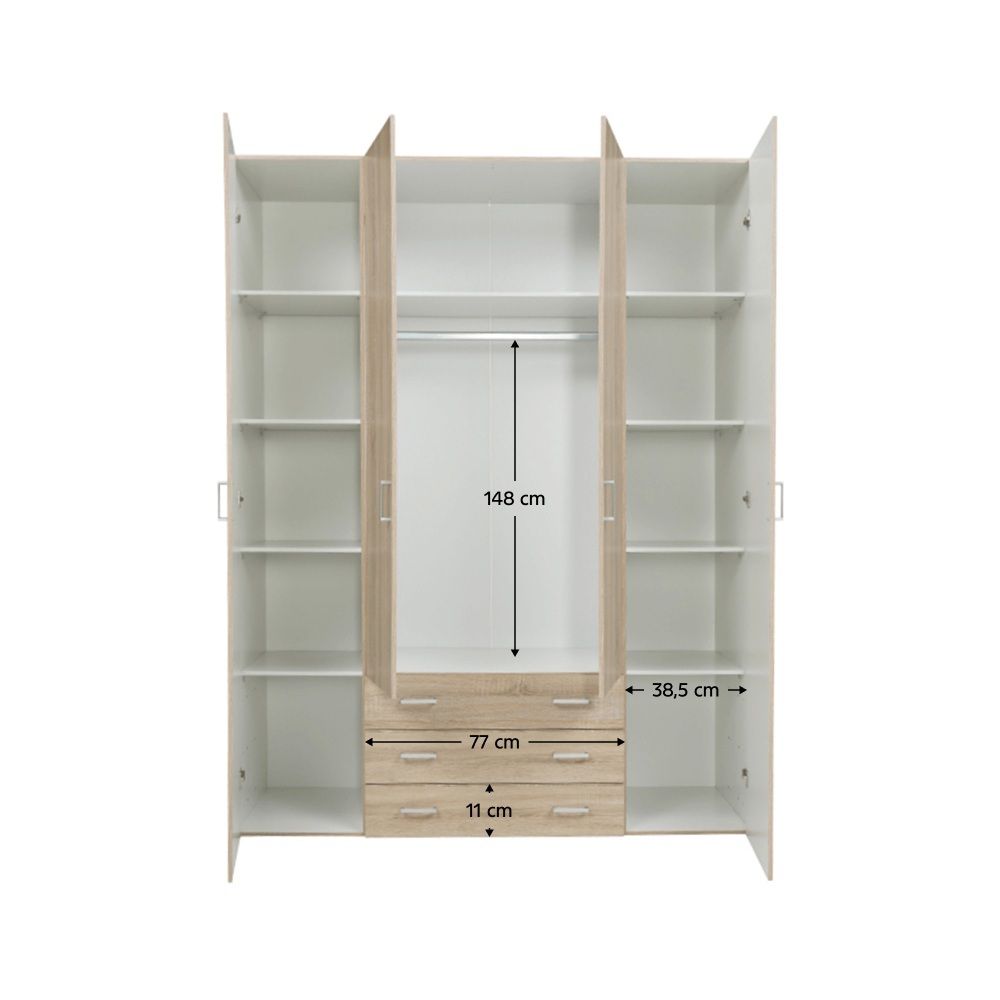 Moderní a praktická čtyřdvéřová kombinovaná skříň, jedna polovina je šatní a jedna polovina je policová se šuplíky.